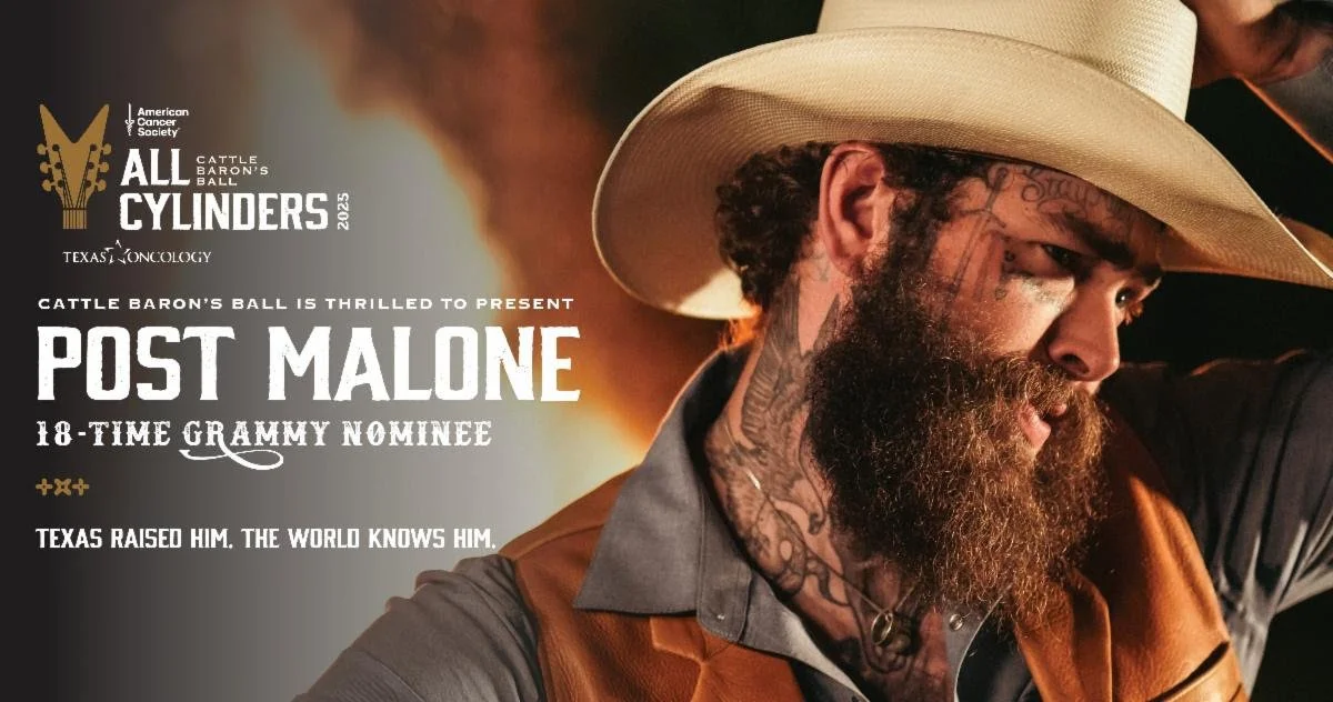 Cattle Baron's Ball has announced Grammy-nominated global superstar Post Malone as the headlining entertainer for the 2025 Cattle Baron's Ball, the world's largest single-night fundraiser for the American Cancer Society. The 52nd Cattle Baron's Ball is presented by Texas Oncology, with entertainment sponsored by White Rhino Coffee. This year's event will take place on October 25, 2025, at Southfork Ranch, with 2025 co-chairs, Courtney Derderian and Nina Sachse, leading the charge. Chandler Walters will be the VIP Stage Performer at this year's Ball, known as the writer of Post Malone and Morgan Wallen's hit song 'I Had Some Help' and is currently on tour with Post Malone. This event will sell out, so get your tickets now! Announced at the Trailblazer's event, the early-bird ticket deadline for the always sold out ball has been extended to June 1. Following that, all tickets, tables, and underwriting levels will increase by 10%.