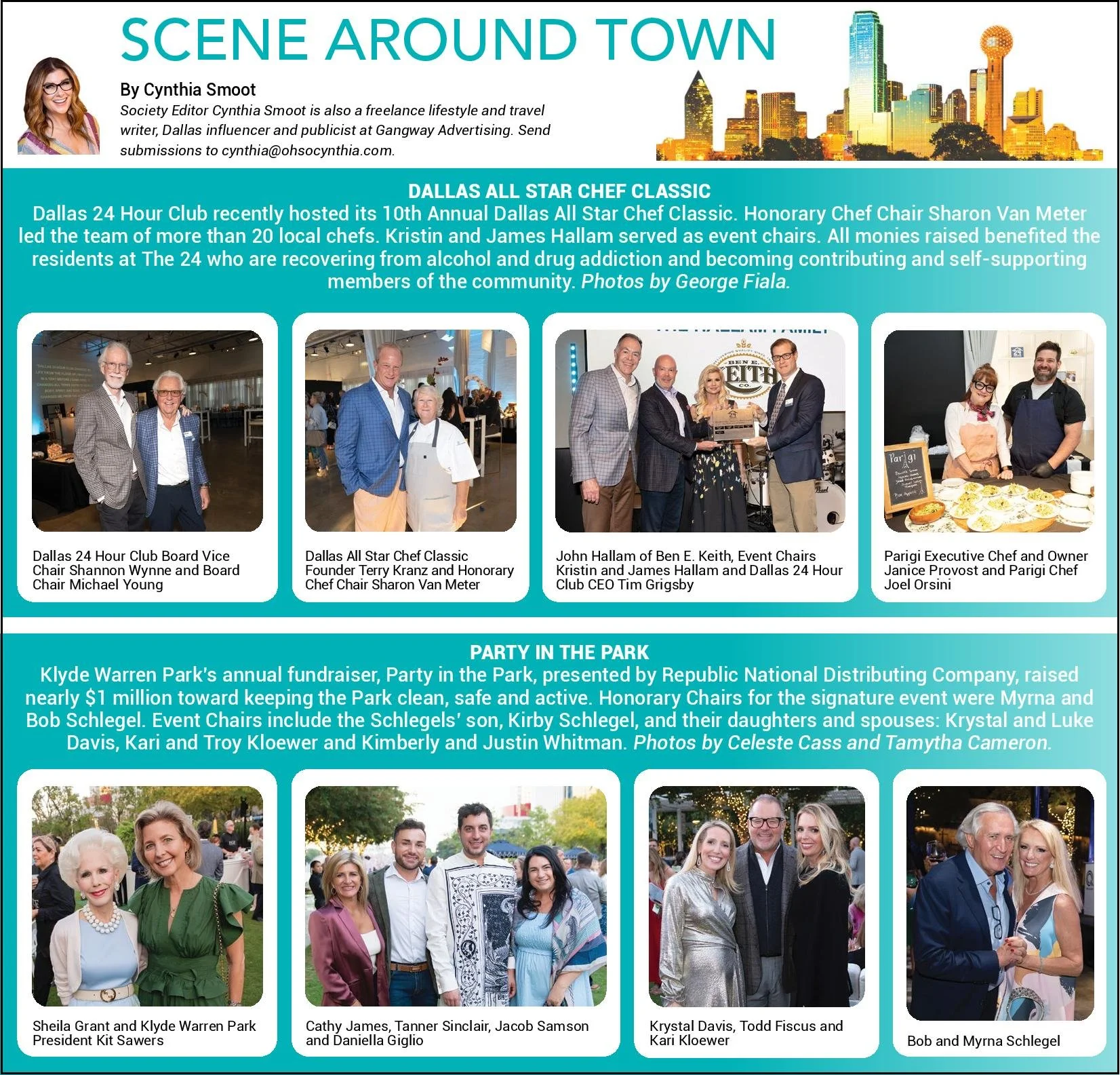 As Society Editor for the Katy Trail Weekly I oversee the publication's Scene Around Town feature, which shines a spotlight on nonprofit and community events each week. In this week’s November 17 issue, I was pleased to spotlight photos featuring highlights from Dallas 24 Hour Club who recently hosted its 10th Annual Dallas All Star Chef Classic. Honorary Chef Chair Sharon Van Meter led the team of more than 20 local chefs while Kristin and James Hallam served as event chairs. All monies raised during the Dallas All Star Chef Classic directly benefited the Residents at The 24 who are recovering from alcohol and drug addiction and are becoming contributing and self-supporting members of the community. Also featured is Klyde Warren Park whose annual fundraiser, Party in the Park, presented by Republic National Distributing Company, raised almost $1 million toward keeping the Park clean, safe and active. Honorary Chairs for this signature event were Myrna and Bob Schlegel. Event Chairs include the Schlegels’ son, Kirby Schlegel, and their daughters and spouses: Krystal and Luke Davis, Kari and Troy Kloewer and Kimberly and Justin Whitman.