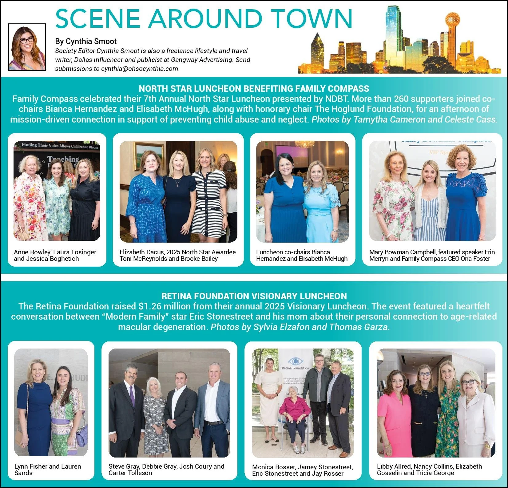 As Society Editor for the Katy Trail Weekly I oversee the publication's Scene Around Town feature, which shines a spotlight on nonprofit and community events each week. In this week’s July 18 issue, I’m featuring scenes from Family Compass who celebrated their 7th Annual North Star Luncheon presented by NDBT on Monday, April 28. More than 260 supporters joined co-chairs Bianca Hernandez and Elisabeth McHugh, along with honorary chair The Hoglund Foundation, for an afternoon of mission-driven connection and impact in support of preventing child abuse and neglect. Also highlighted were scenes from the Retina Foundation who raised $1.26 million this past May from their annual 2025 Visionary Luncheon. The event featured a heartfelt conversation between Modern Family star Eric Stonestreet and his mom about their personal connection to age-related macular degeneration.