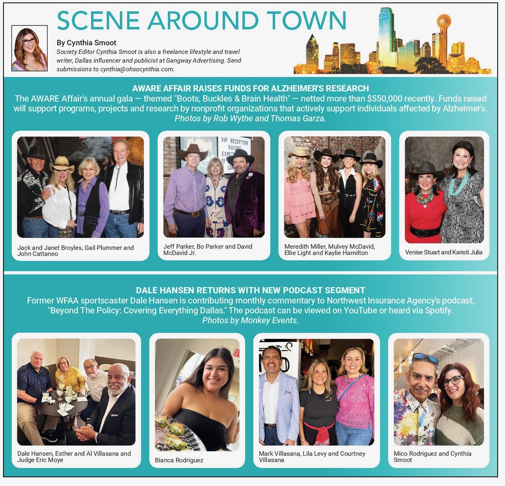 As Society Editor for the Katy Trail Weekly I oversee the publication's Scene Around Town feature, which shines a spotlight on nonprofit and community events each week. In this week’s August 15 issue, I’m featuring scenes from AWARE Affair 2025: Boots, Buckles & Brain Health which netted just over $550,000 this past May. Funds raised will support programs, projects, and research by nonprofit organizations that actively support individuals affected by Alzheimer's. Also featured are images from former WFAA sportscaster Dale Hansen who is contributing monthly commentary to Northwest Insurance Agency's podcast, "Beyond The Policy: Covering Everything Dallas." The podcast can be viewed on YouTube or heard via Spotify.
