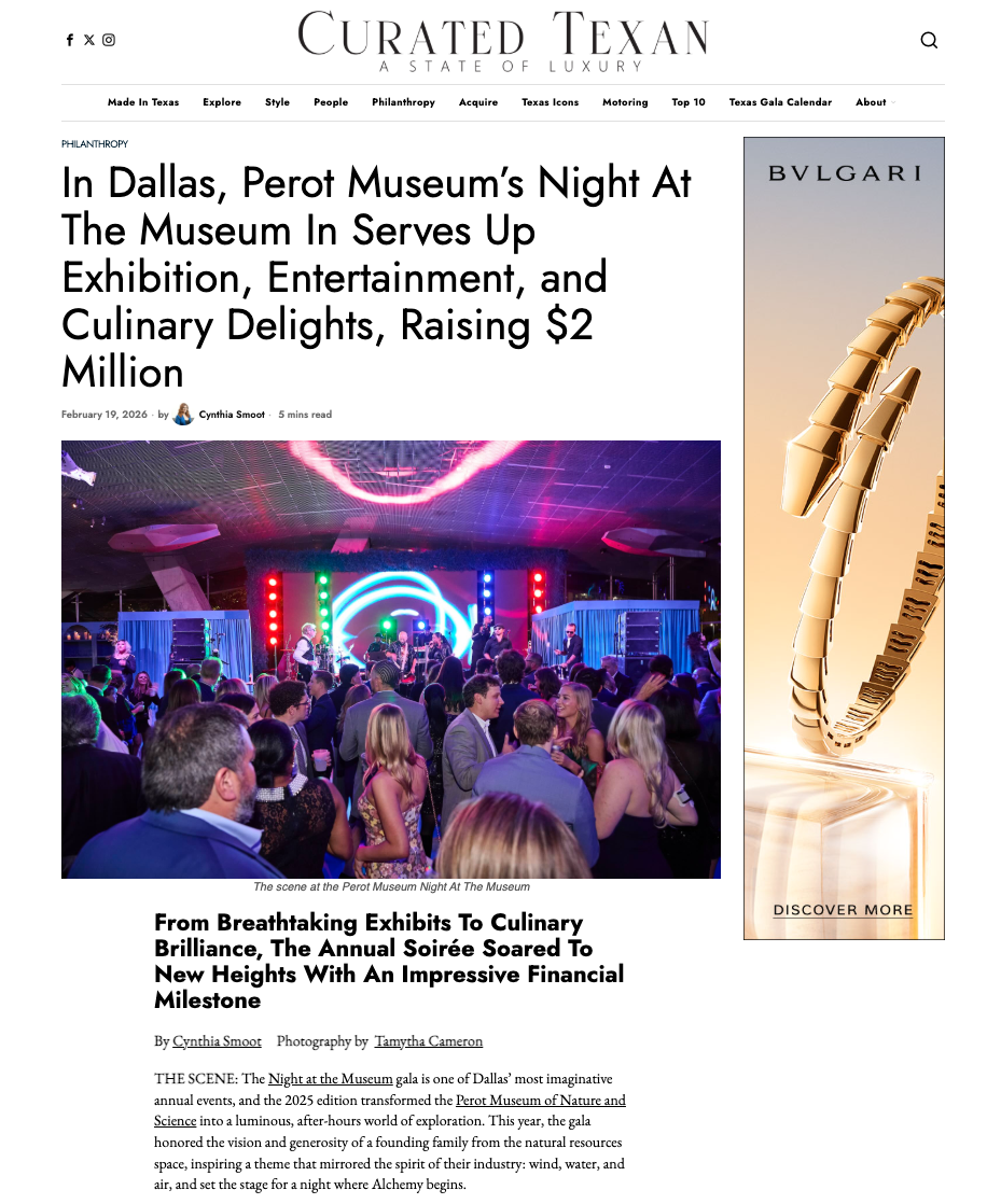 The Night at the Museum gala is one of Dallas’ most imaginative annual events, and the 2025 edition transformed the Perot Museum of Nature and Science into a luminous, after-hours world of exploration. This year, the gala honored the vision and generosity of a founding family from the natural resources space, inspiring a theme that mirrored the spirit of their industry: wind, water, and air, and set the stage for a night where Alchemy begins. Click HERE to read this article in its entirety.