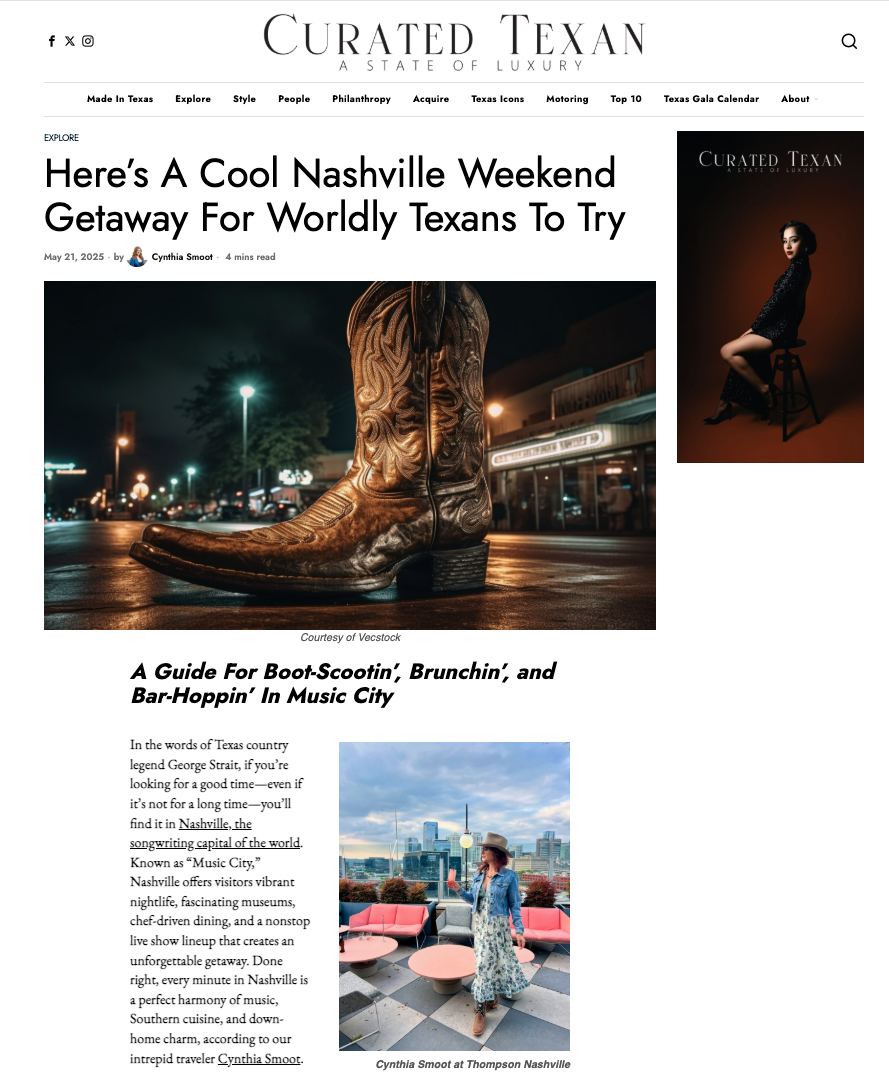 I recently spent a fun-filled few days in Music City and shared my adventure on Curated Texan. Click HERE to read my tips and tricks to enjoy a boot-scootin’, brunchin’, and bar-hoppin’ time in Nashville, Tennessee.