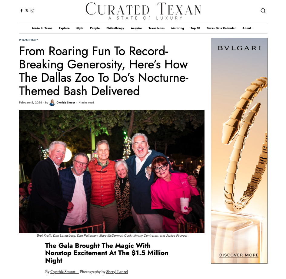 Over 800 guests gathered at the Dallas Zoo on Saturday, November 1, for Zoo To Do 2025: Nocturne. It was an enchanting evening filled with food, music, and mission that raised an outstanding $1.5 million in support of the Dallas Zoo’s mission of “Engaging People & Saving Wildlife.” Event Chairs Robbie Kruithoff and Ryan Ross, alongside Honorary Co-Chairs Lois Finkelman and Joan Walne, led this year’s annual event. To read this event recap in its entirety, visit Curated Texan.